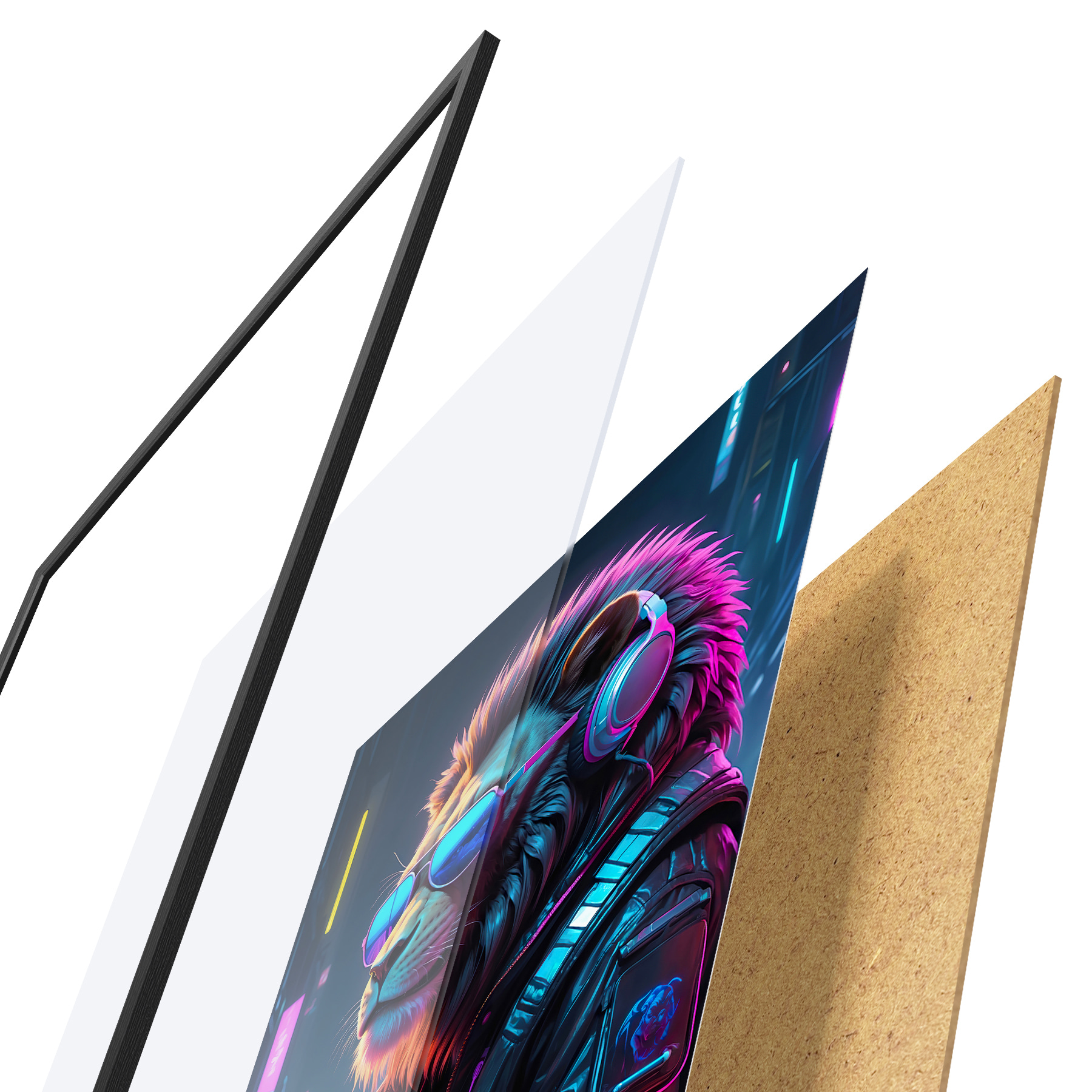 El póster consta de marco, plexiglás, imagen impresa y soporte de aglomerado. El póster puede colgarse inmediatamente en la pared gracias a los soportes de la parte posterior.