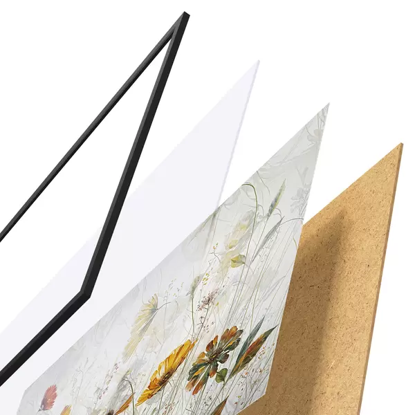 El póster consta de marco, plexiglás, imagen impresa y soporte de aglomerado. El póster puede colgarse inmediatamente en la pared gracias a los soportes de la parte posterior.