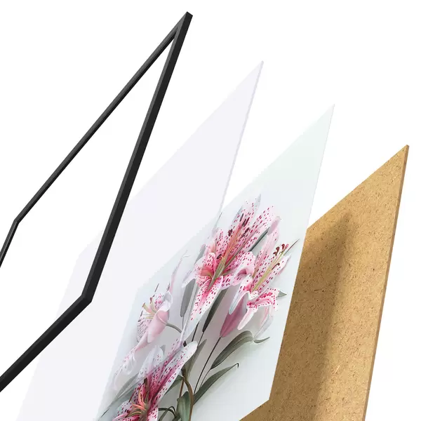 El póster consta de marco, plexiglás, imagen impresa y soporte de aglomerado. El póster puede colgarse inmediatamente en la pared gracias a los soportes de la parte posterior.