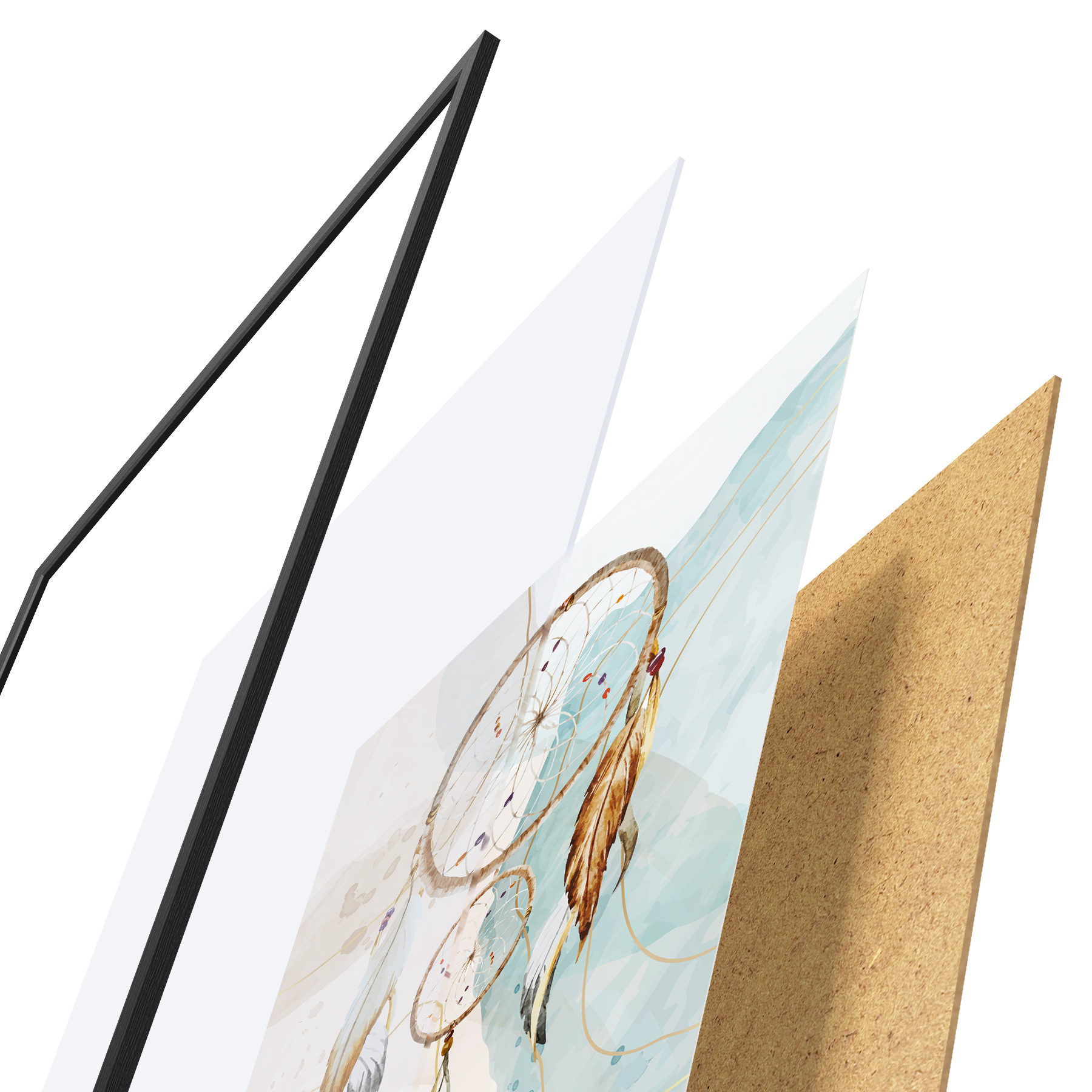 El póster consta de marco, plexiglás, imagen impresa y soporte de aglomerado. El póster puede colgarse inmediatamente en la pared gracias a los soportes de la parte posterior.