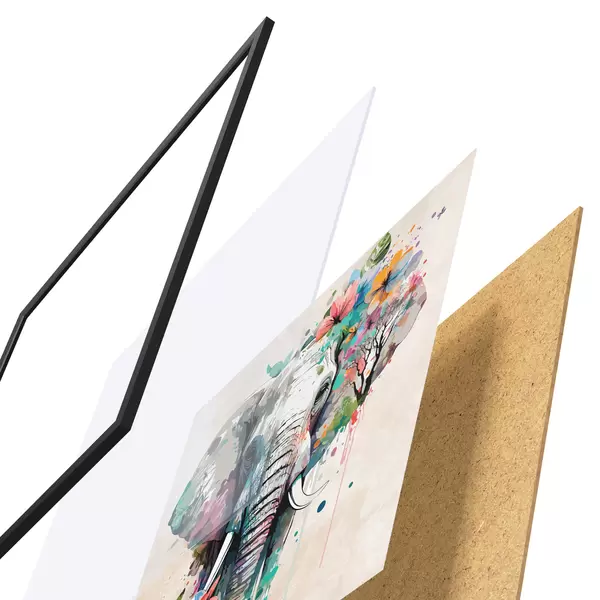 El póster consta de marco, plexiglás, imagen impresa y soporte de aglomerado. El póster puede colgarse inmediatamente en la pared gracias a los soportes de la parte posterior.