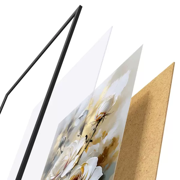 El póster consta de marco, plexiglás, imagen impresa y soporte de aglomerado. El póster puede colgarse inmediatamente en la pared gracias a los soportes de la parte posterior.