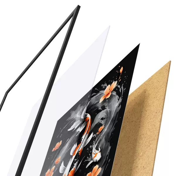 El póster consta de marco, plexiglás, imagen impresa y soporte de aglomerado. El póster puede colgarse inmediatamente en la pared gracias a los soportes de la parte posterior.