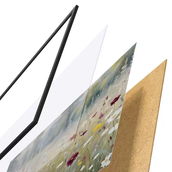 El póster consta de marco, plexiglás, imagen impresa y soporte de aglomerado. El póster puede colgarse inmediatamente en la pared gracias a los soportes de la parte posterior.