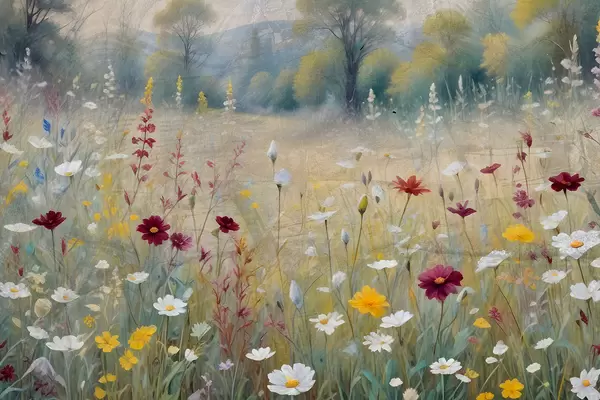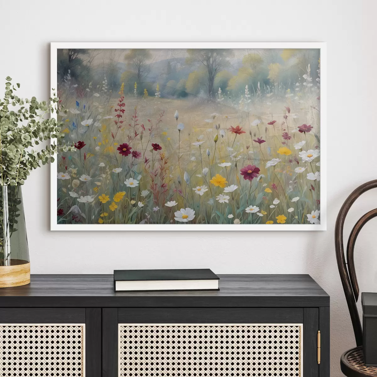 Poster Un colorido prado con flores silvestres con un bosque borroso al fondo Nr f38368