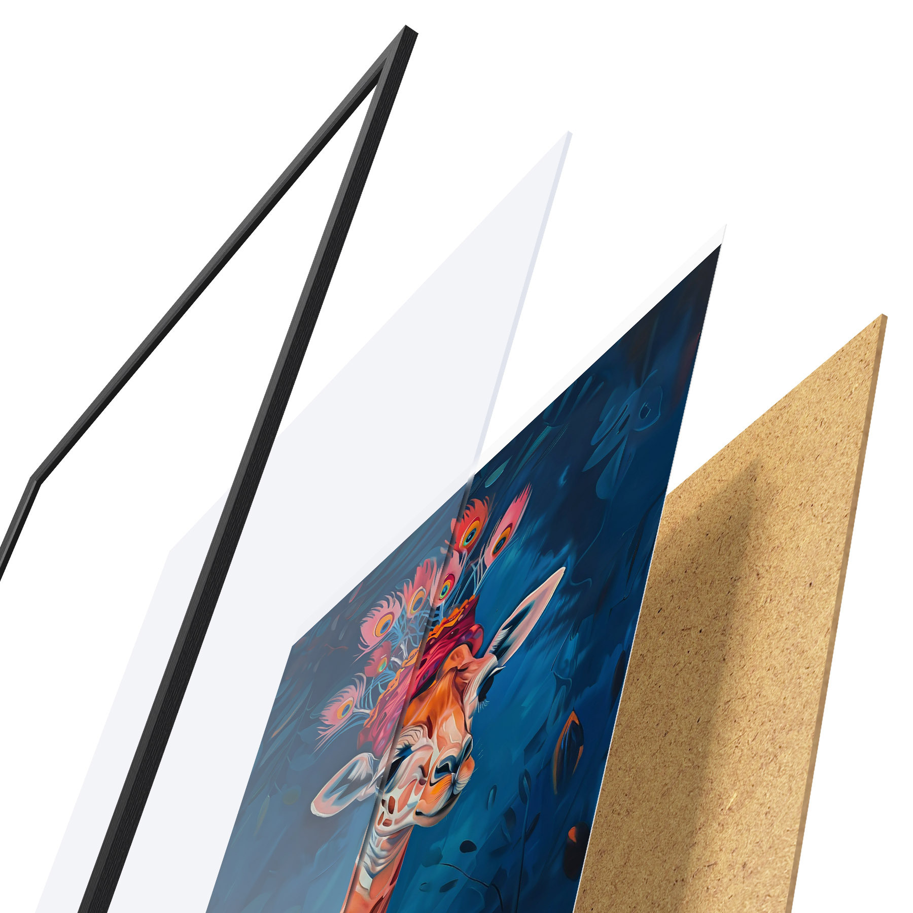 El póster consta de marco, plexiglás, imagen impresa y soporte de aglomerado. El póster puede colgarse inmediatamente en la pared gracias a los soportes de la parte posterior.