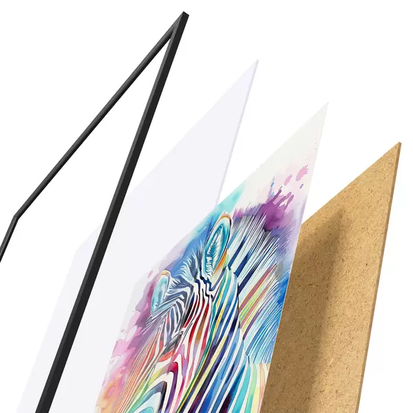 El póster consta de marco, plexiglás, imagen impresa y soporte de aglomerado. El póster puede colgarse inmediatamente en la pared gracias a los soportes de la parte posterior.