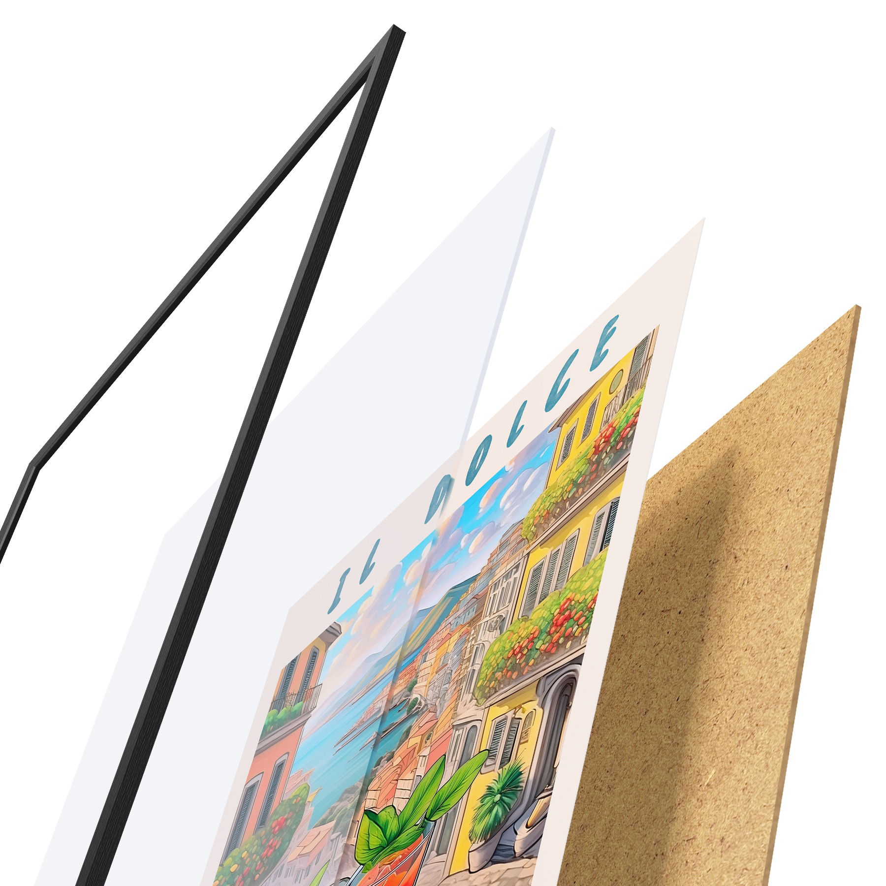 El póster consta de marco, plexiglás, imagen impresa y soporte de aglomerado. El póster puede colgarse inmediatamente en la pared gracias a los soportes de la parte posterior.