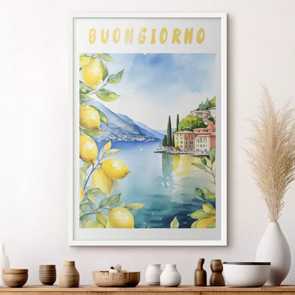 Poster Lago italiano, verano, acuarela, paisaje natural, limones, arquitectura de la ciudad Nr f38394