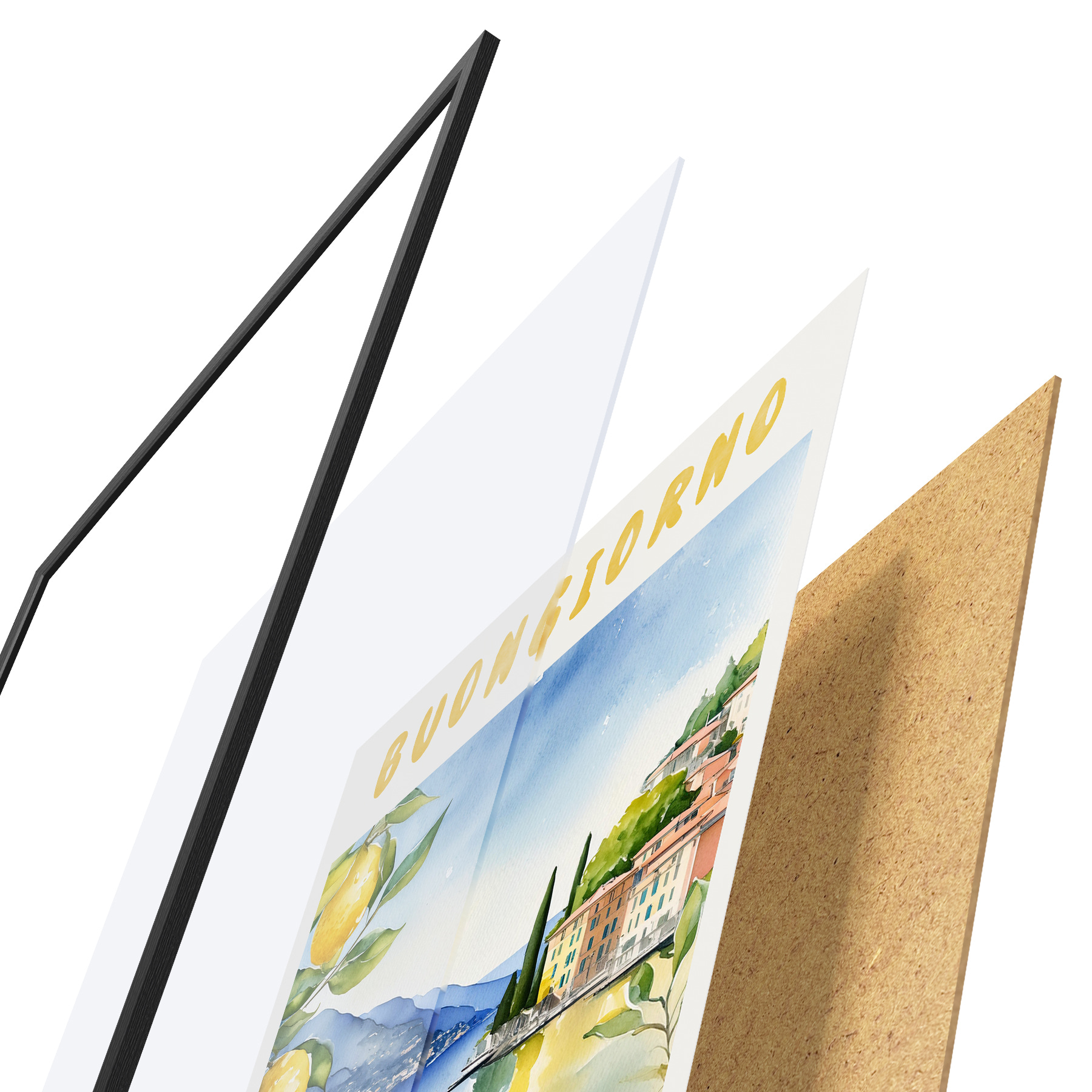 El póster consta de marco, plexiglás, imagen impresa y soporte de aglomerado. El póster puede colgarse inmediatamente en la pared gracias a los soportes de la parte posterior.