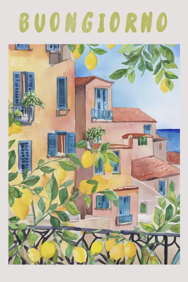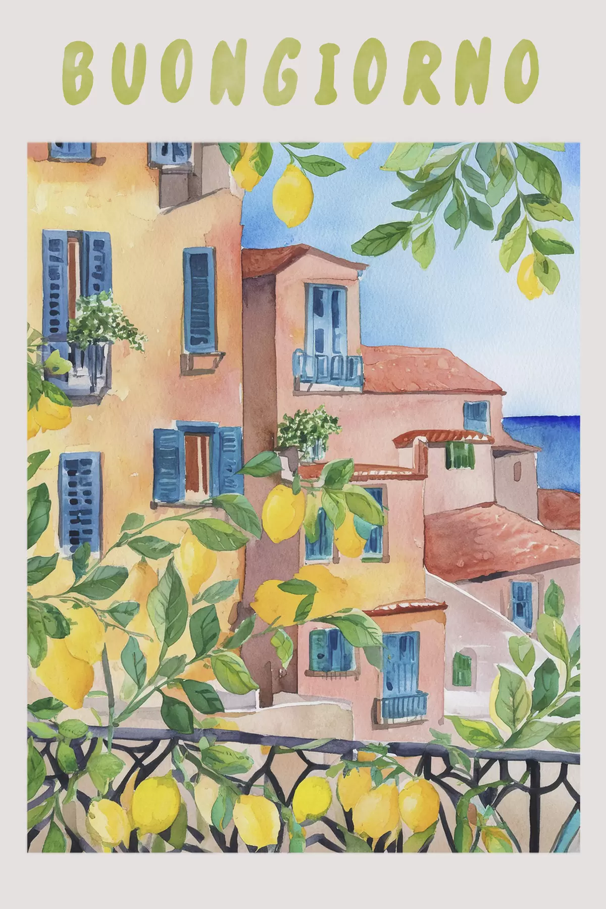 Poster Arquitectura de la ciudad italiana, costa del mar, verano, acuarela, limonero Nr f38395
