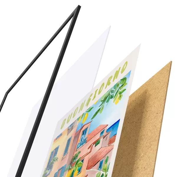 El póster consta de marco, plexiglás, imagen impresa y soporte de aglomerado. El póster puede colgarse inmediatamente en la pared gracias a los soportes de la parte posterior.