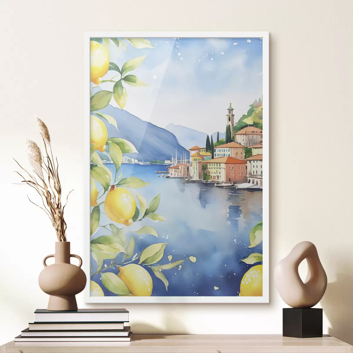Poster Lago italiano, verano, acuarela, paisaje natural, limones, arquitectura de la ciudad f38397