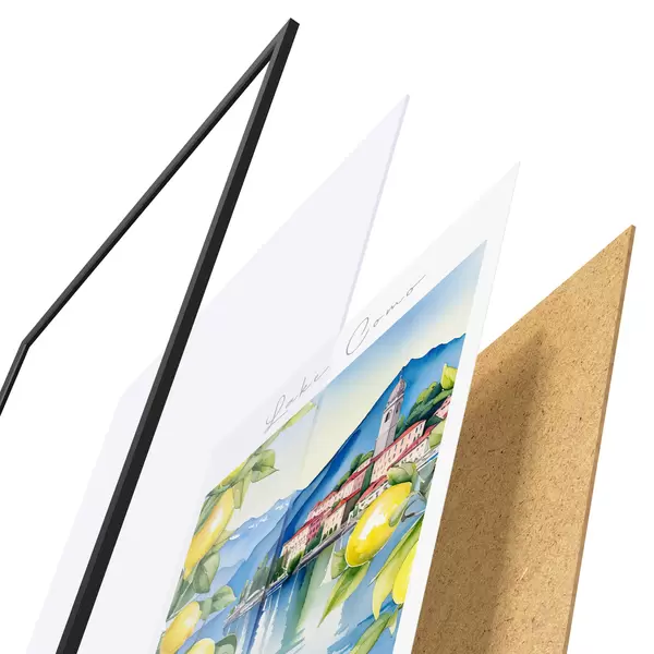 El póster consta de marco, plexiglás, imagen impresa y soporte de aglomerado. El póster puede colgarse inmediatamente en la pared gracias a los soportes de la parte posterior.