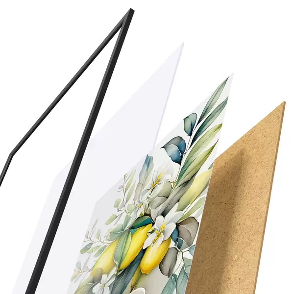 El póster consta de marco, plexiglás, imagen impresa y soporte de aglomerado. El póster puede colgarse inmediatamente en la pared gracias a los soportes de la parte posterior.