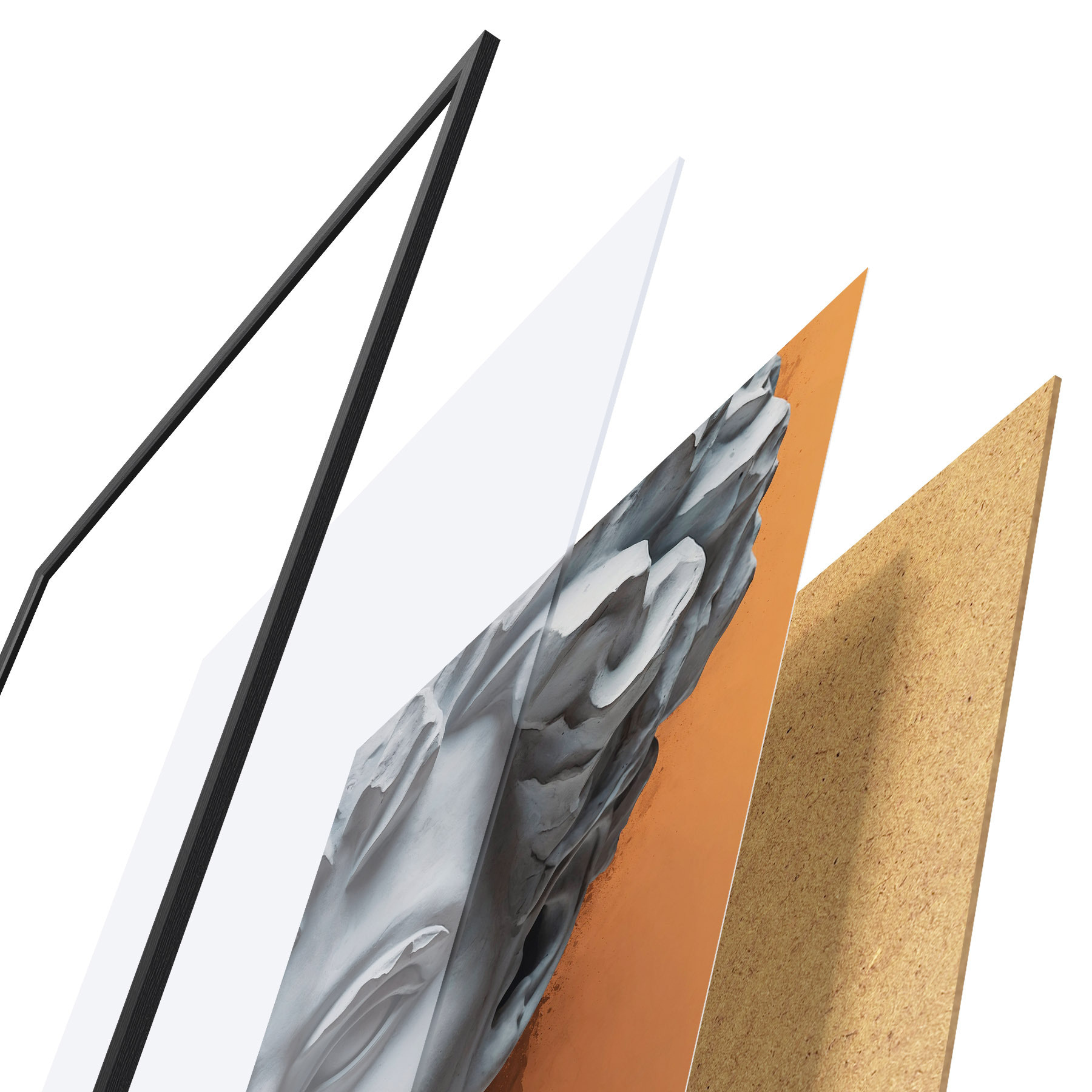 El póster consta de marco, plexiglás, imagen impresa y soporte de aglomerado. El póster puede colgarse inmediatamente en la pared gracias a los soportes de la parte posterior.