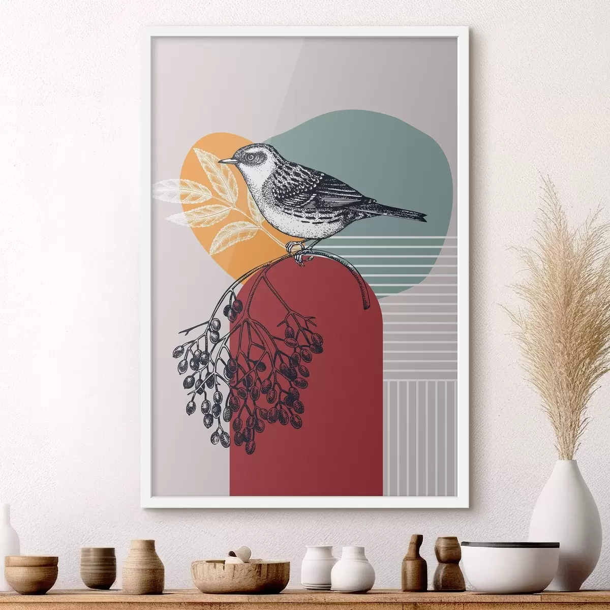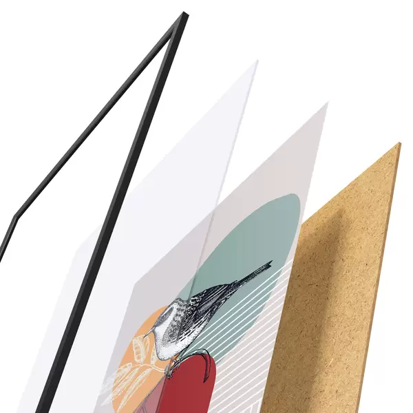 El póster consta de marco, plexiglás, imagen impresa y soporte de aglomerado. El póster puede colgarse inmediatamente en la pared gracias a los soportes de la parte posterior.