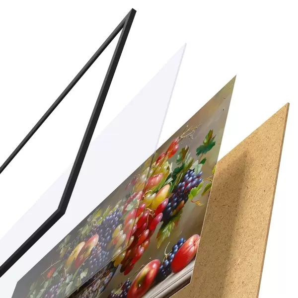 El póster consta de marco, plexiglás, imagen impresa y soporte de aglomerado. El póster puede colgarse inmediatamente en la pared gracias a los soportes de la parte posterior.
