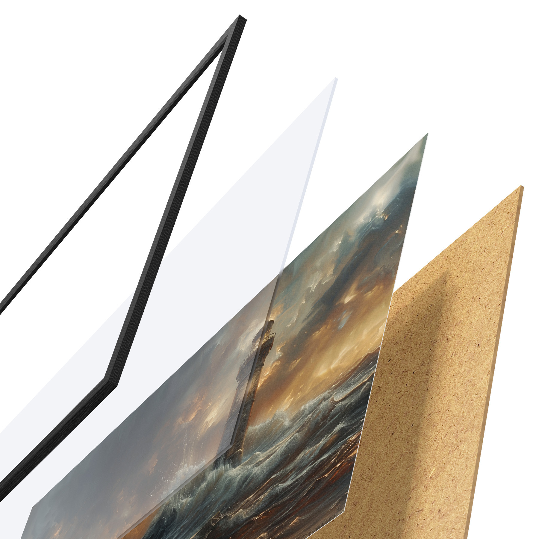 El póster consta de marco, plexiglás, imagen impresa y soporte de aglomerado. El póster puede colgarse inmediatamente en la pared gracias a los soportes de la parte posterior.