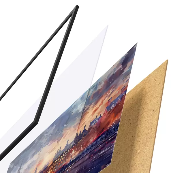 El póster consta de marco, plexiglás, imagen impresa y soporte de aglomerado. El póster puede colgarse inmediatamente en la pared gracias a los soportes de la parte posterior.