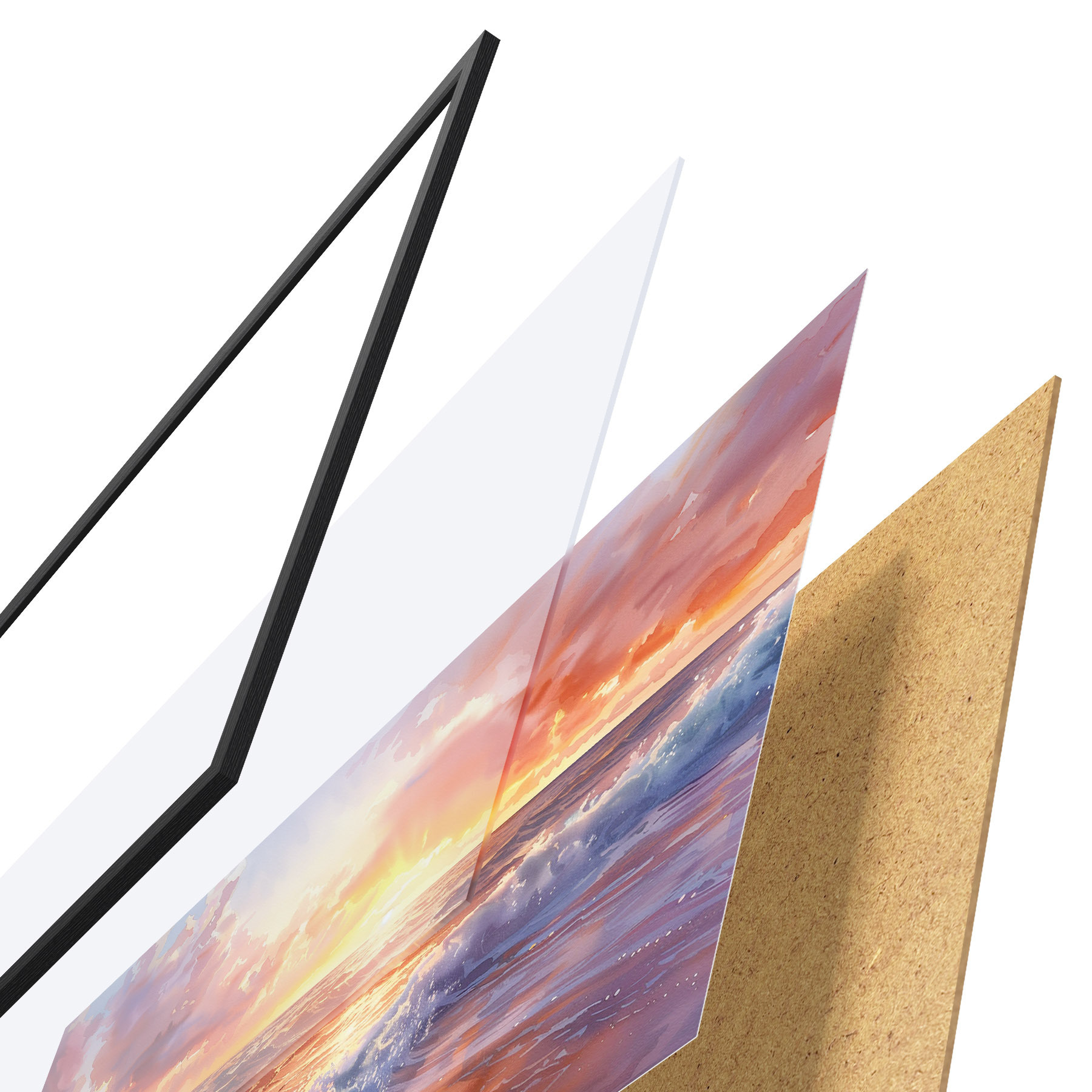 El póster consta de marco, plexiglás, imagen impresa y soporte de aglomerado. El póster puede colgarse inmediatamente en la pared gracias a los soportes de la parte posterior.