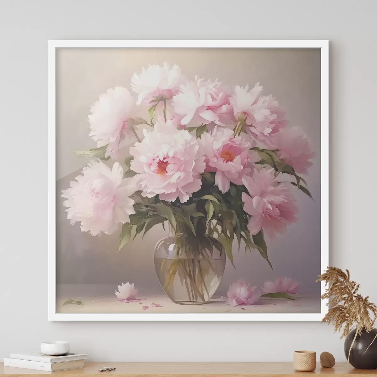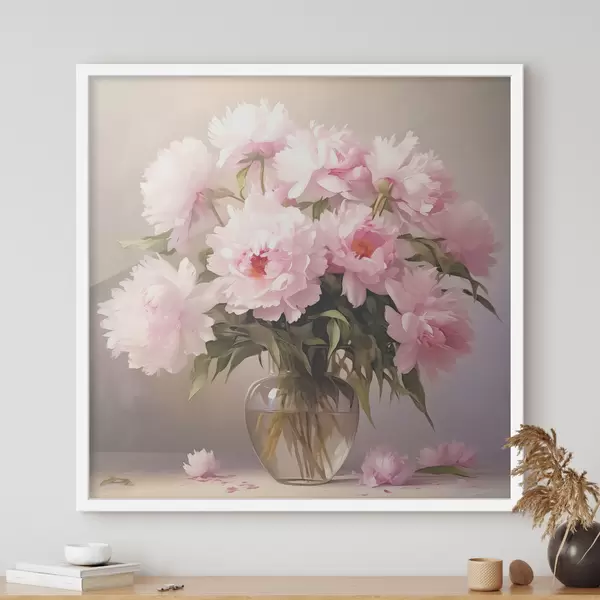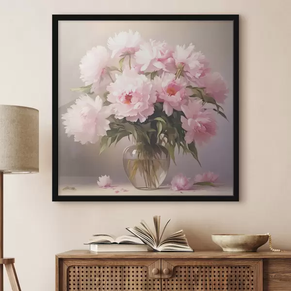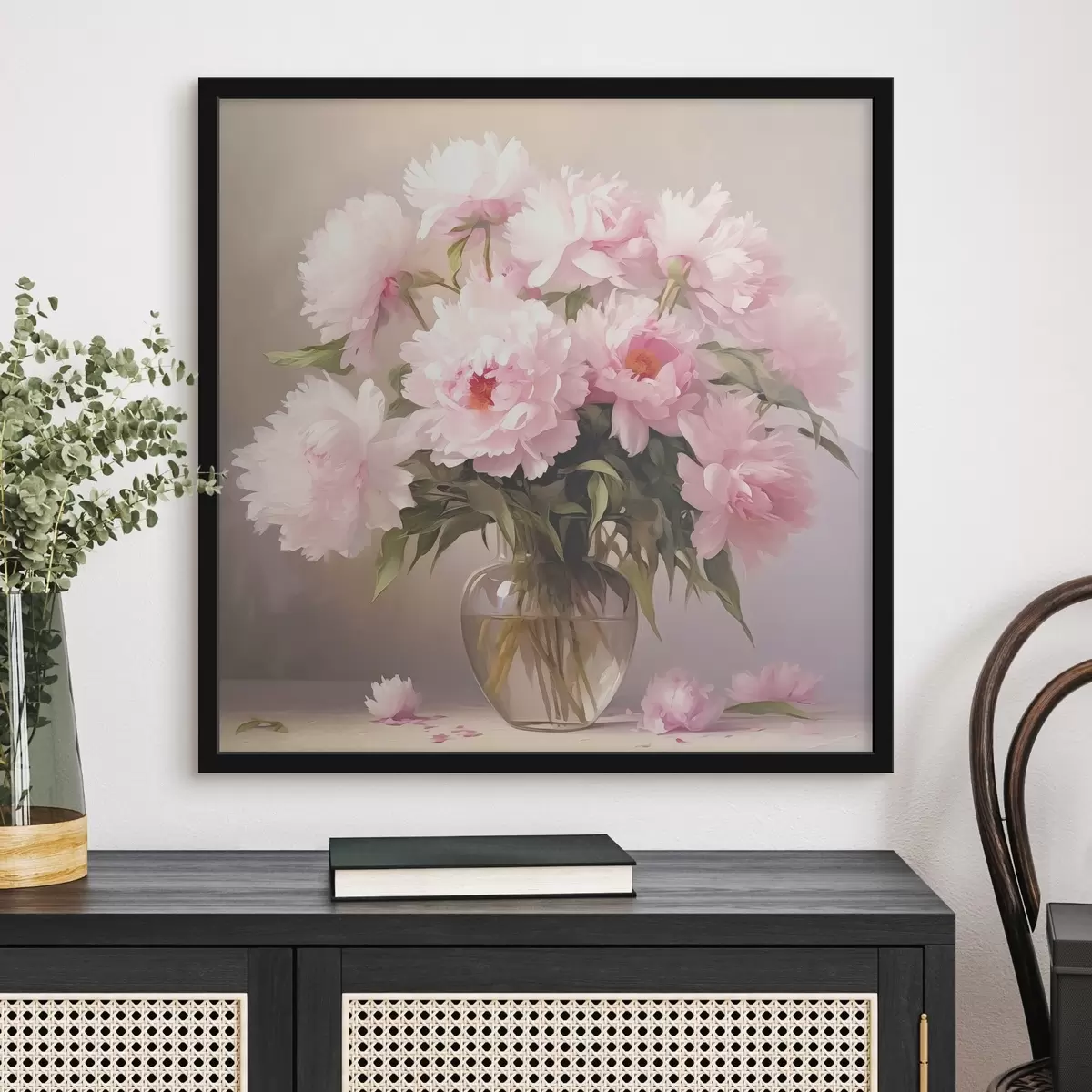 Poster Peonías rosas en un jarrón de cristal sobre fondo negro, imitación de una pintura al óleo, flores Nr f38482