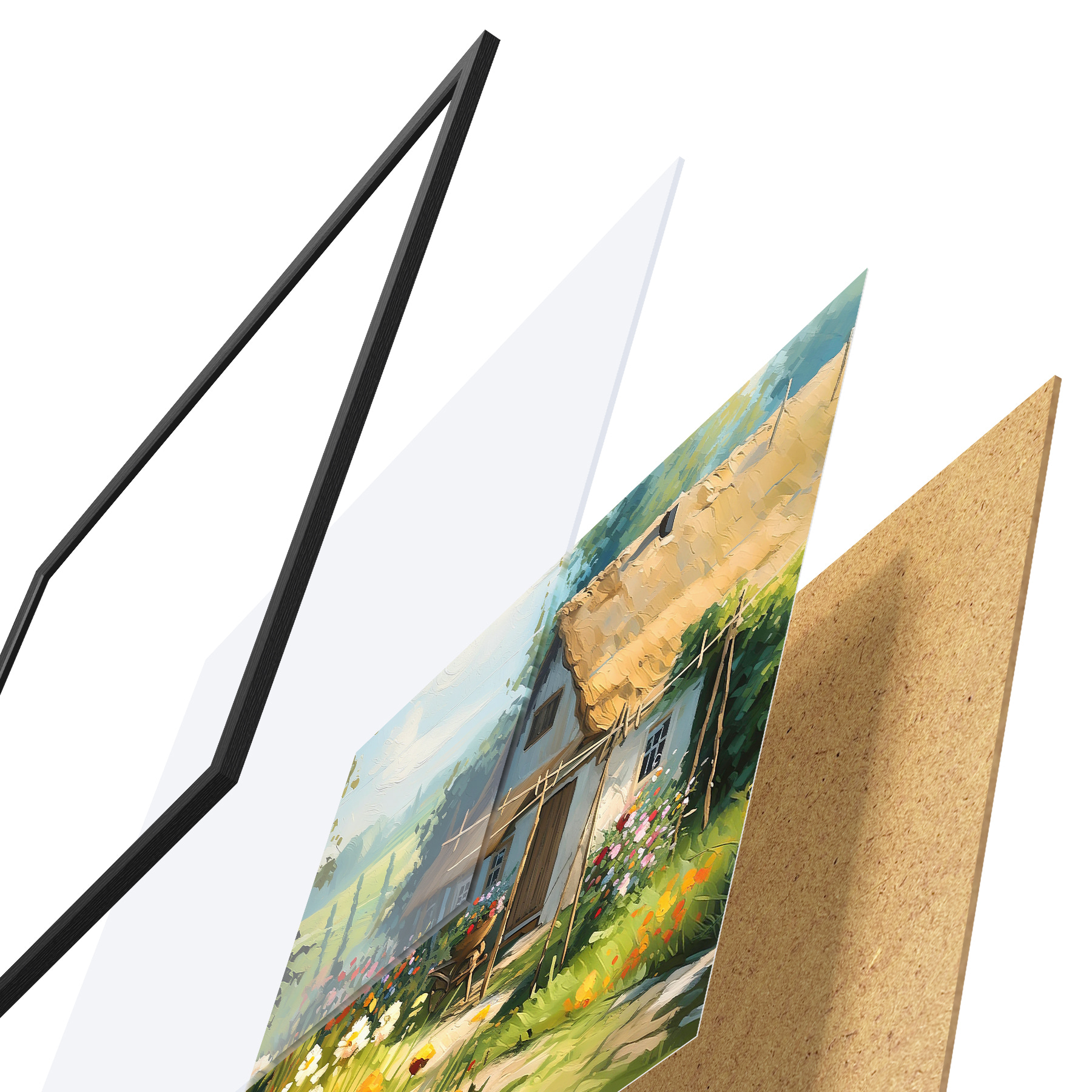 Poster Casa de pueblo con jardín, flores de verano, pintura al óleo, pinceladas, campo, estilo rústico Nr f38491