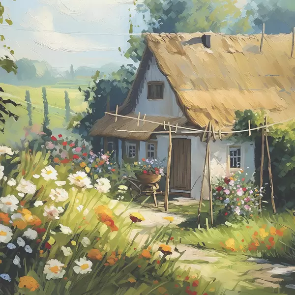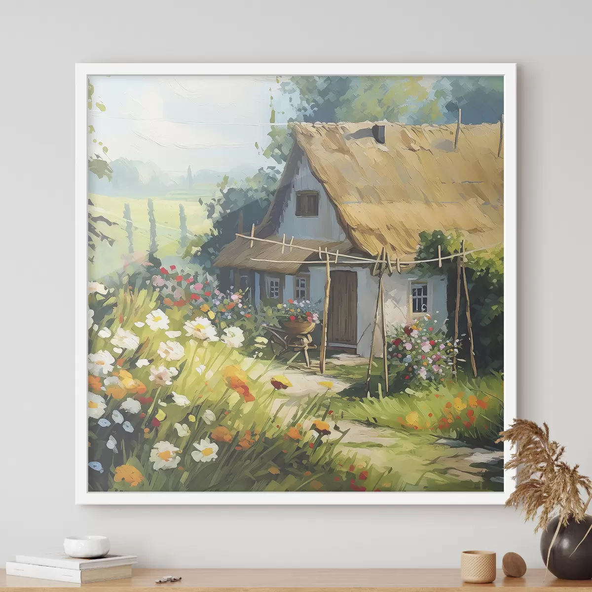 Poster Casa de pueblo con jardín, flores de verano, pintura al óleo, pinceladas, campo, estilo rústico Nr f38491
