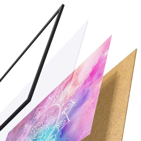 El póster consta de marco, plexiglás, imagen impresa y soporte de aglomerado. El póster puede colgarse inmediatamente en la pared gracias a los soportes de la parte posterior.