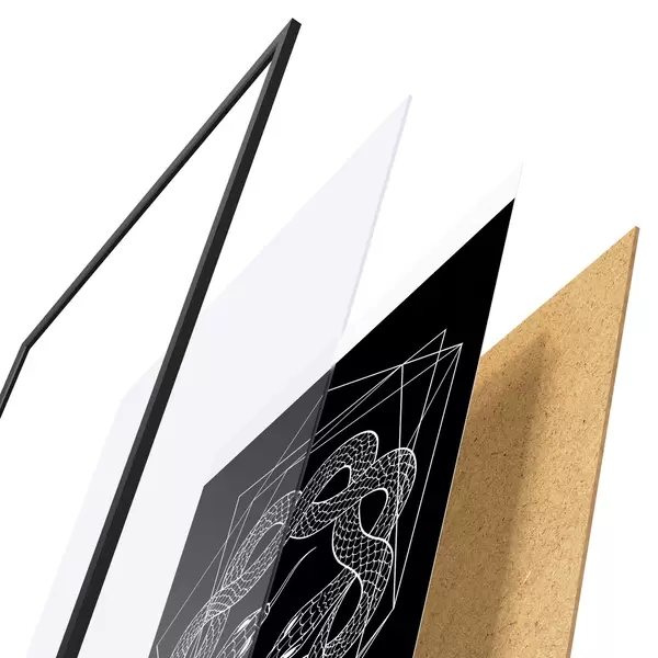 El póster consta de marco, plexiglás, imagen impresa y soporte de aglomerado. El póster puede colgarse inmediatamente en la pared gracias a los soportes de la parte posterior.