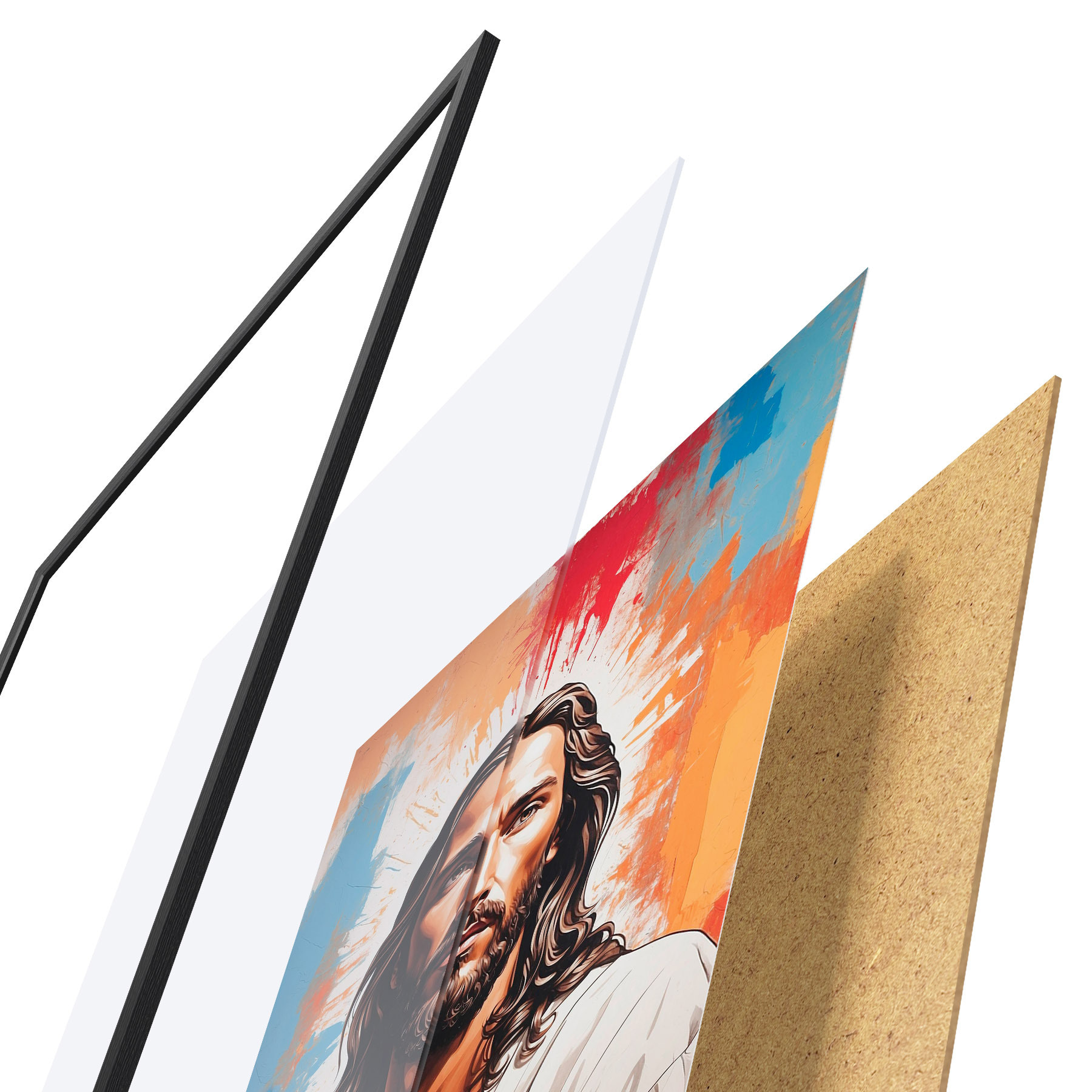 El póster consta de marco, plexiglás, imagen impresa y soporte de aglomerado. El póster puede colgarse inmediatamente en la pared gracias a los soportes de la parte posterior.