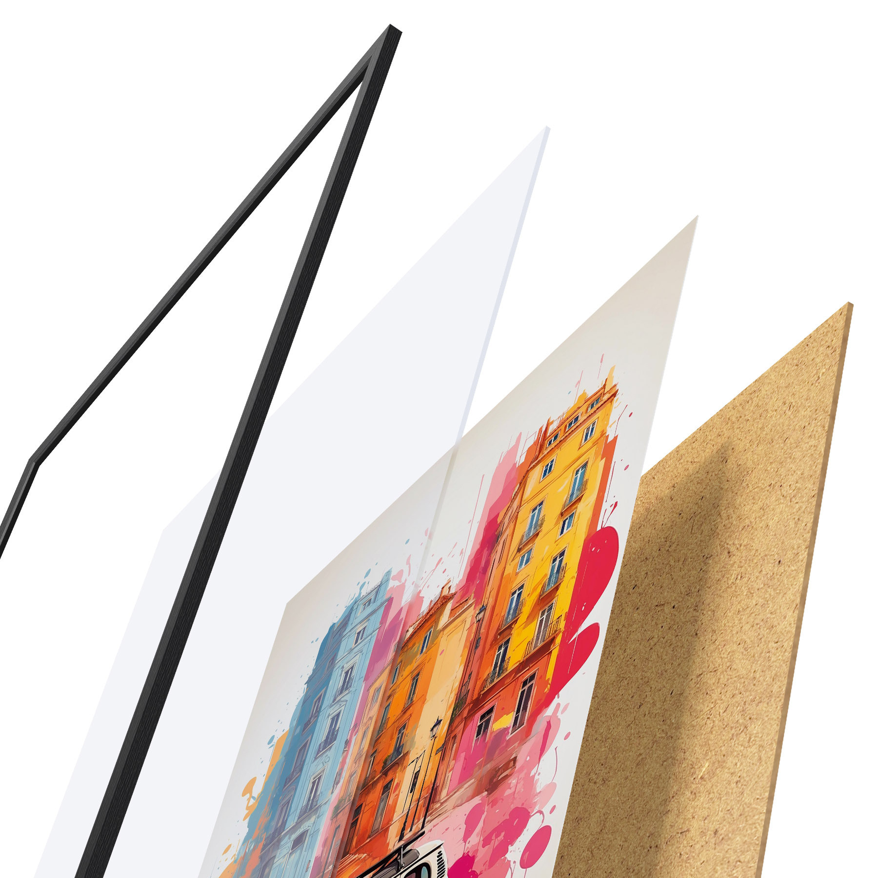 El póster consta de marco, plexiglás, imagen impresa y soporte de aglomerado. El póster puede colgarse inmediatamente en la pared gracias a los soportes de la parte posterior.