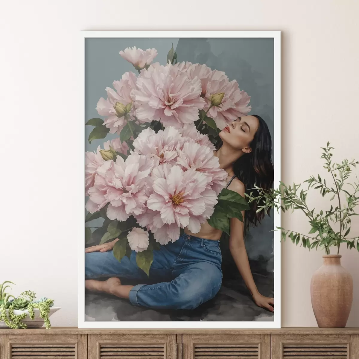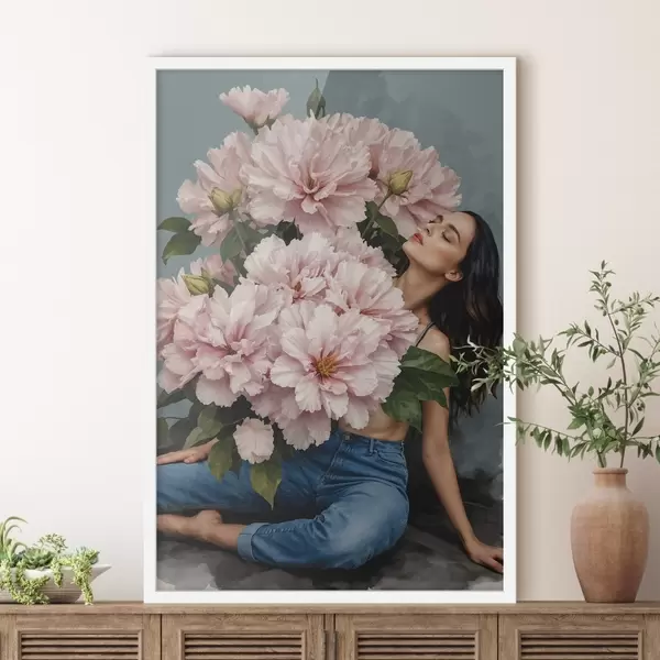 Poster Mujer sentada en el suelo con un gran ramo de flores f38595