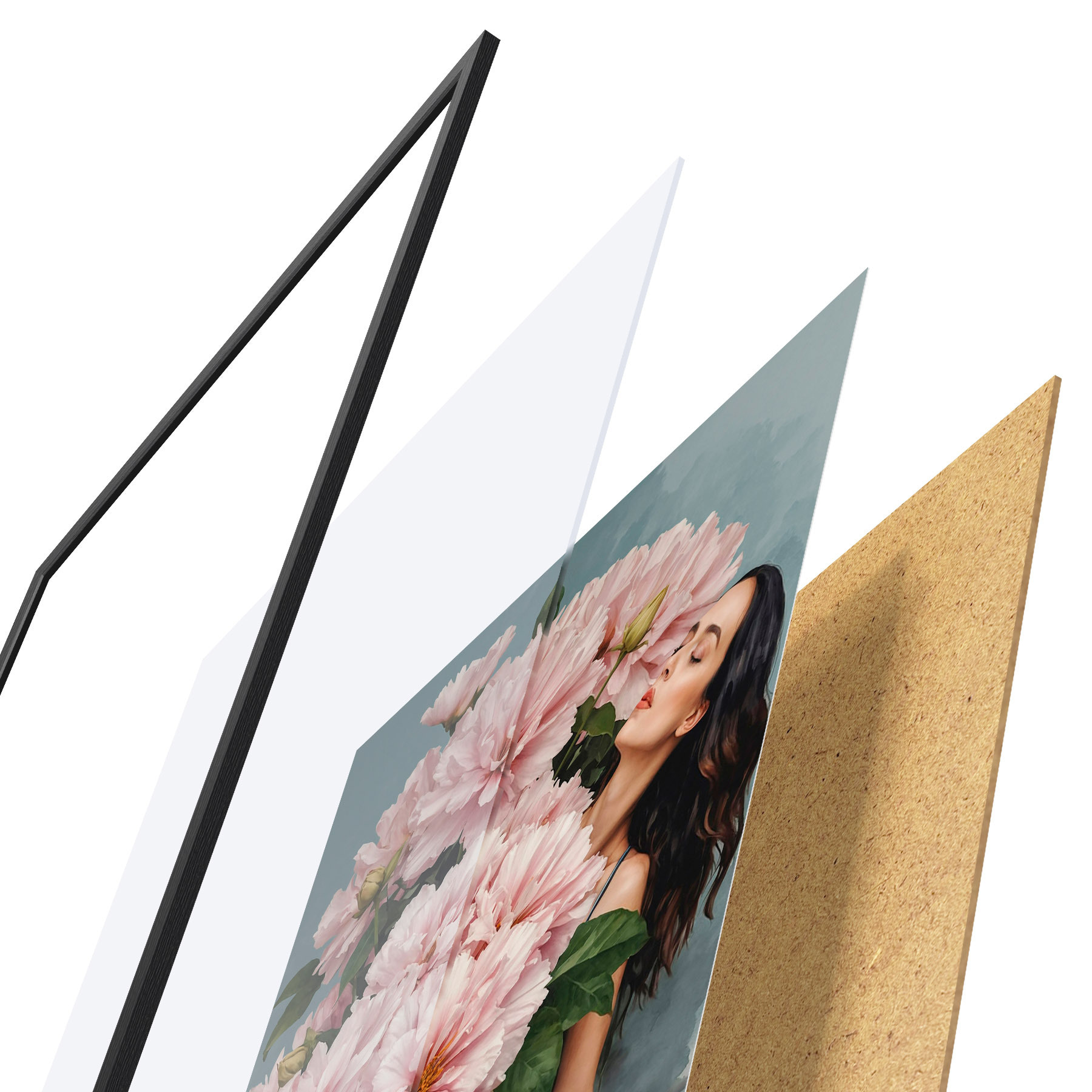 El póster consta de marco, plexiglás, imagen impresa y soporte de aglomerado. El póster puede colgarse inmediatamente en la pared gracias a los soportes de la parte posterior.