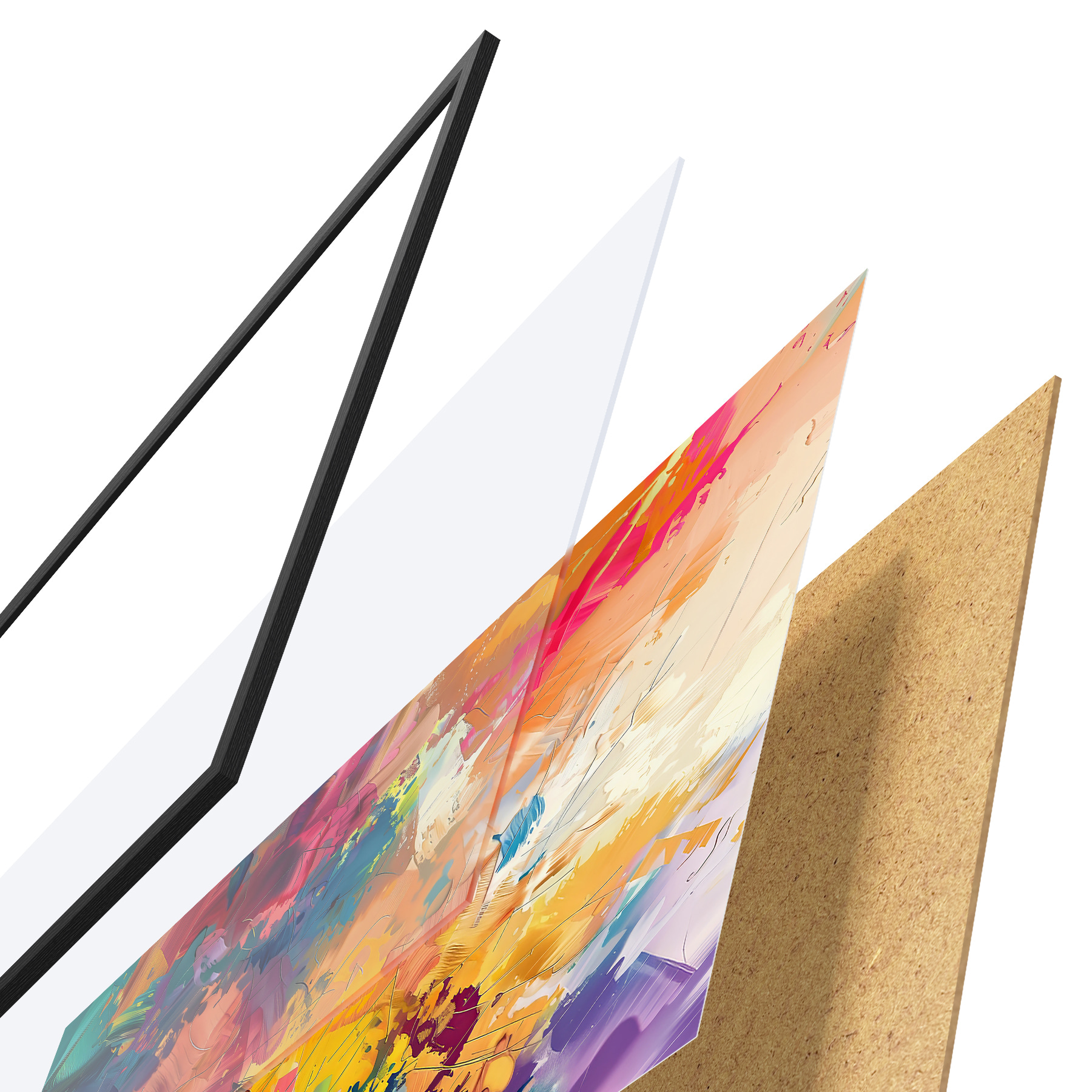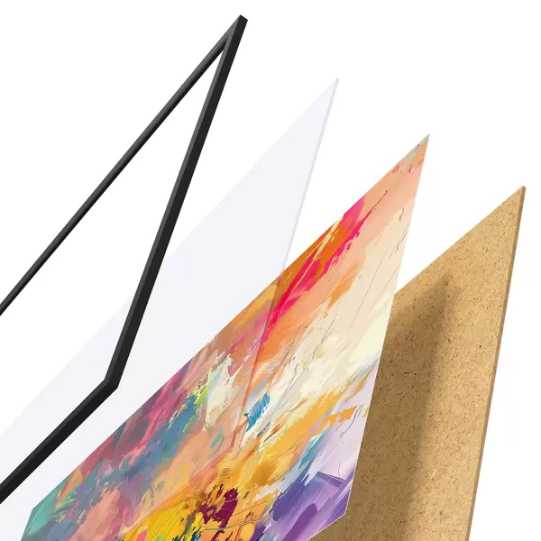El póster consta de marco, plexiglás, imagen impresa y soporte de aglomerado. El póster puede colgarse inmediatamente en la pared gracias a los soportes de la parte posterior.