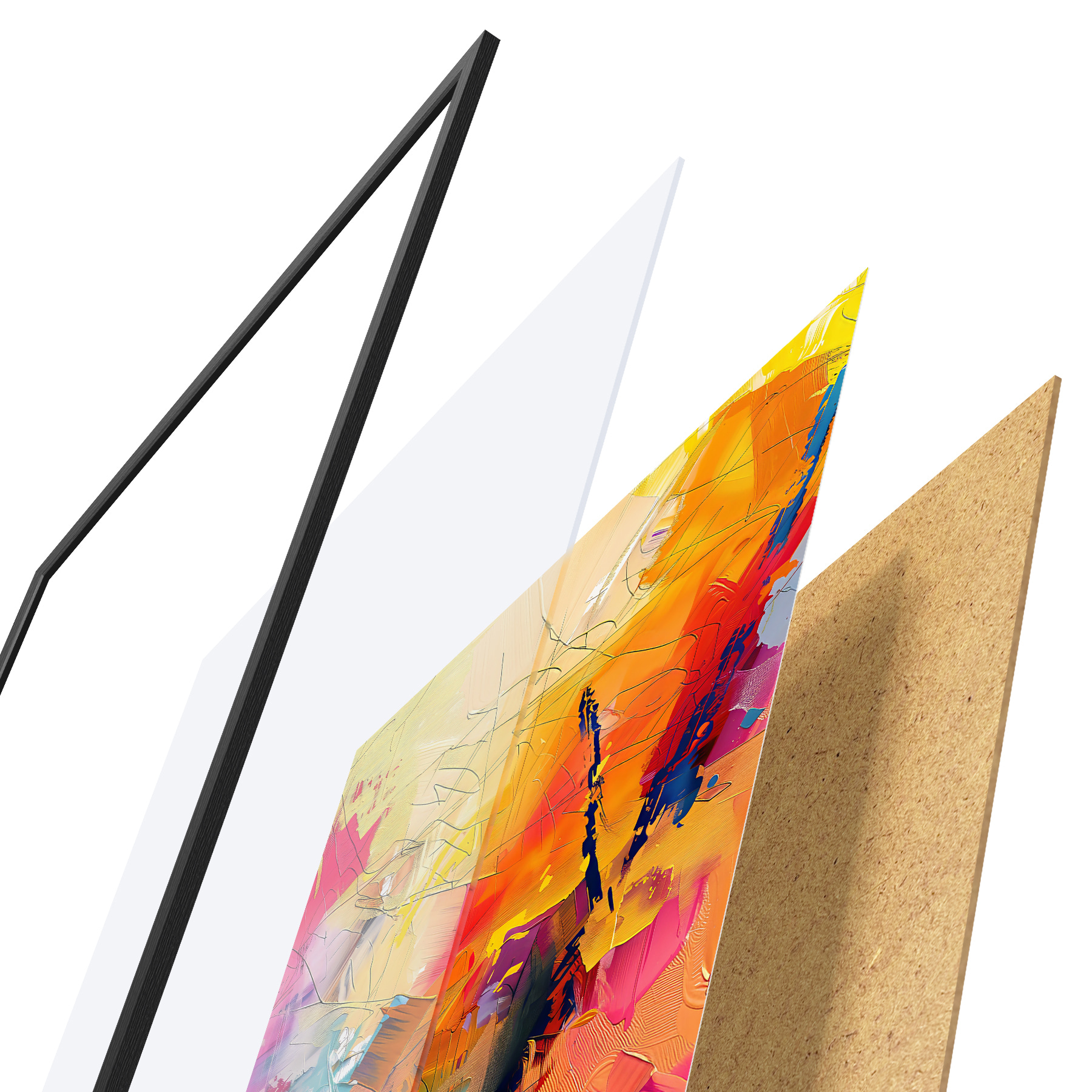 El póster consta de marco, plexiglás, imagen impresa y soporte de aglomerado. El póster puede colgarse inmediatamente en la pared gracias a los soportes de la parte posterior.