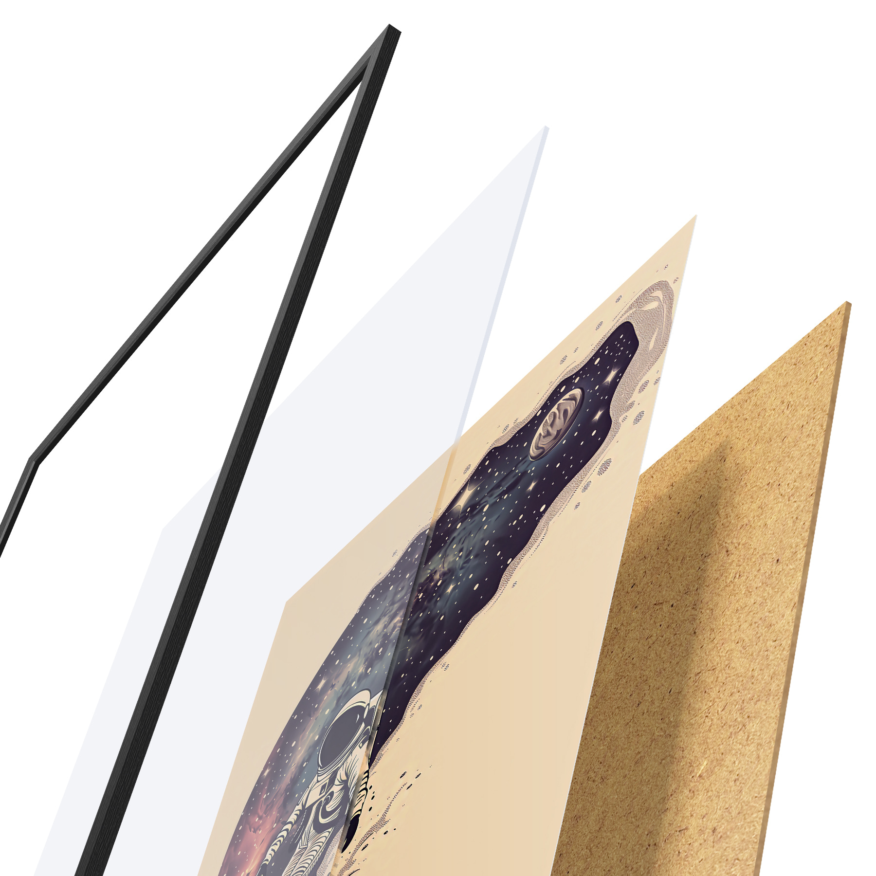 El póster consta de marco, plexiglás, imagen impresa y soporte de aglomerado. El póster puede colgarse inmediatamente en la pared gracias a los soportes de la parte posterior.