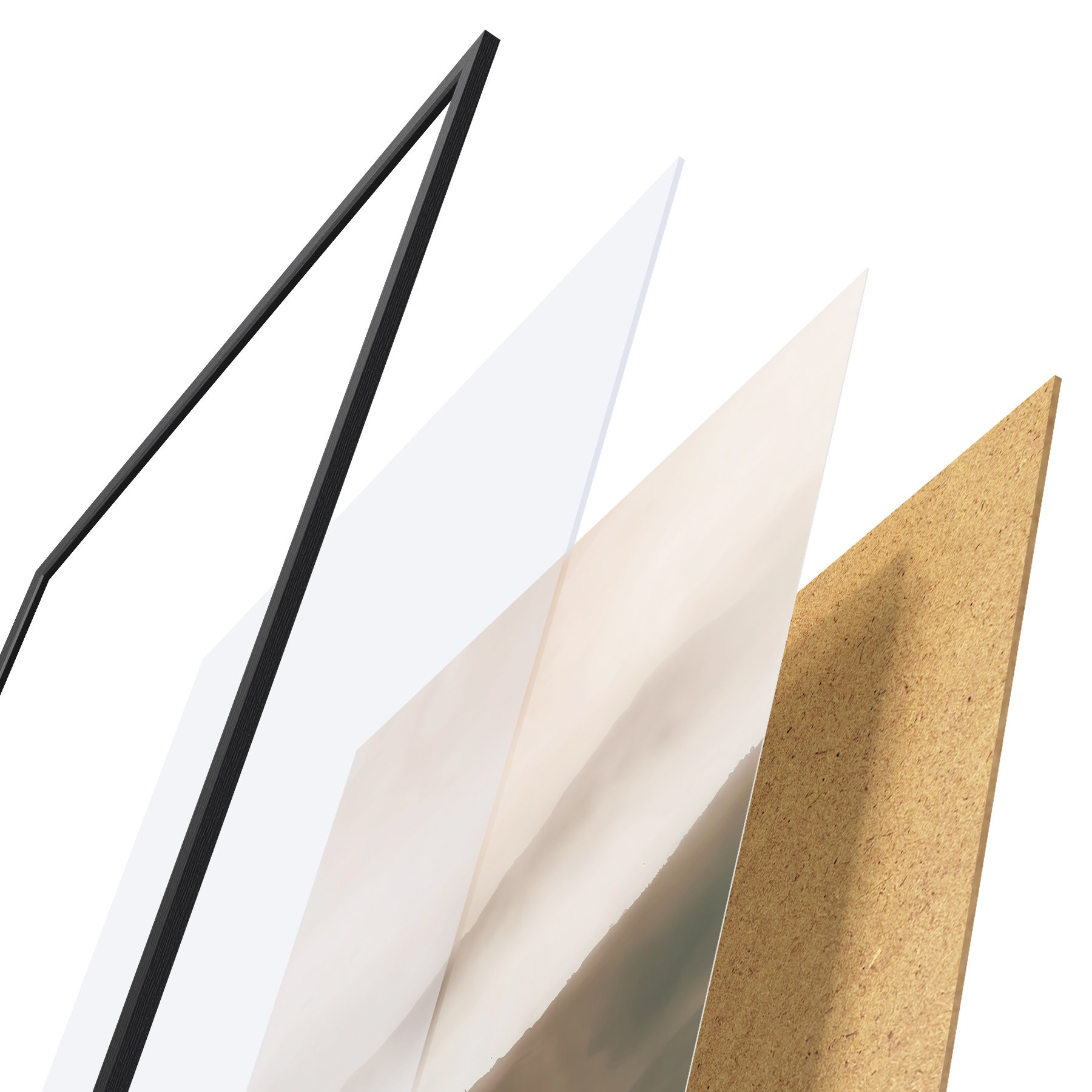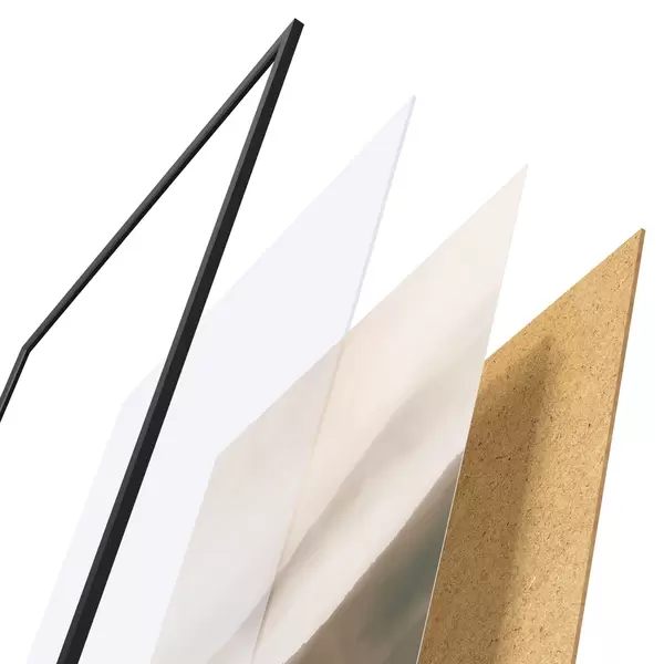 El póster consta de marco, plexiglás, imagen impresa y soporte de aglomerado. El póster puede colgarse inmediatamente en la pared gracias a los soportes de la parte posterior.