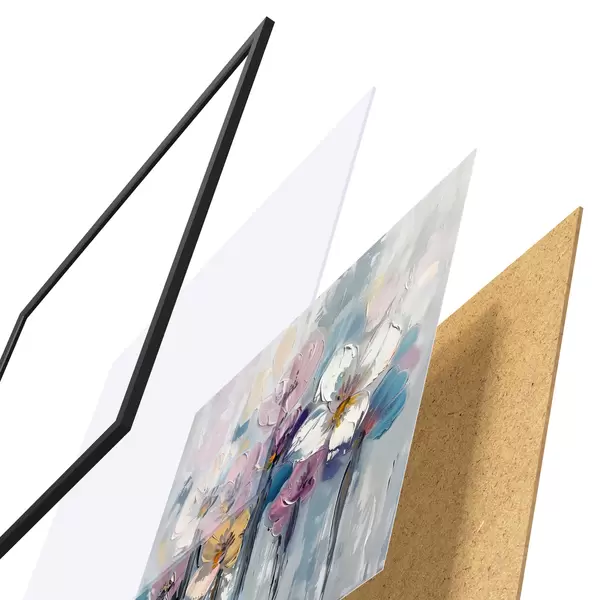 El póster consta de marco, plexiglás, imagen impresa y soporte de aglomerado. El póster puede colgarse inmediatamente en la pared gracias a los soportes de la parte posterior.