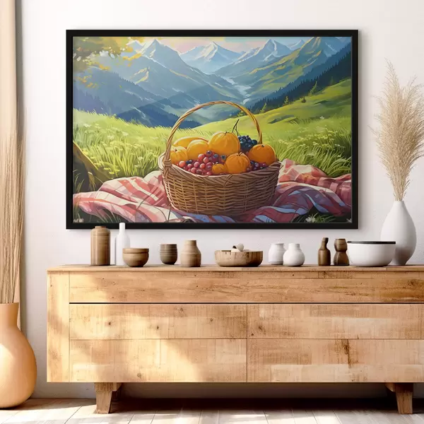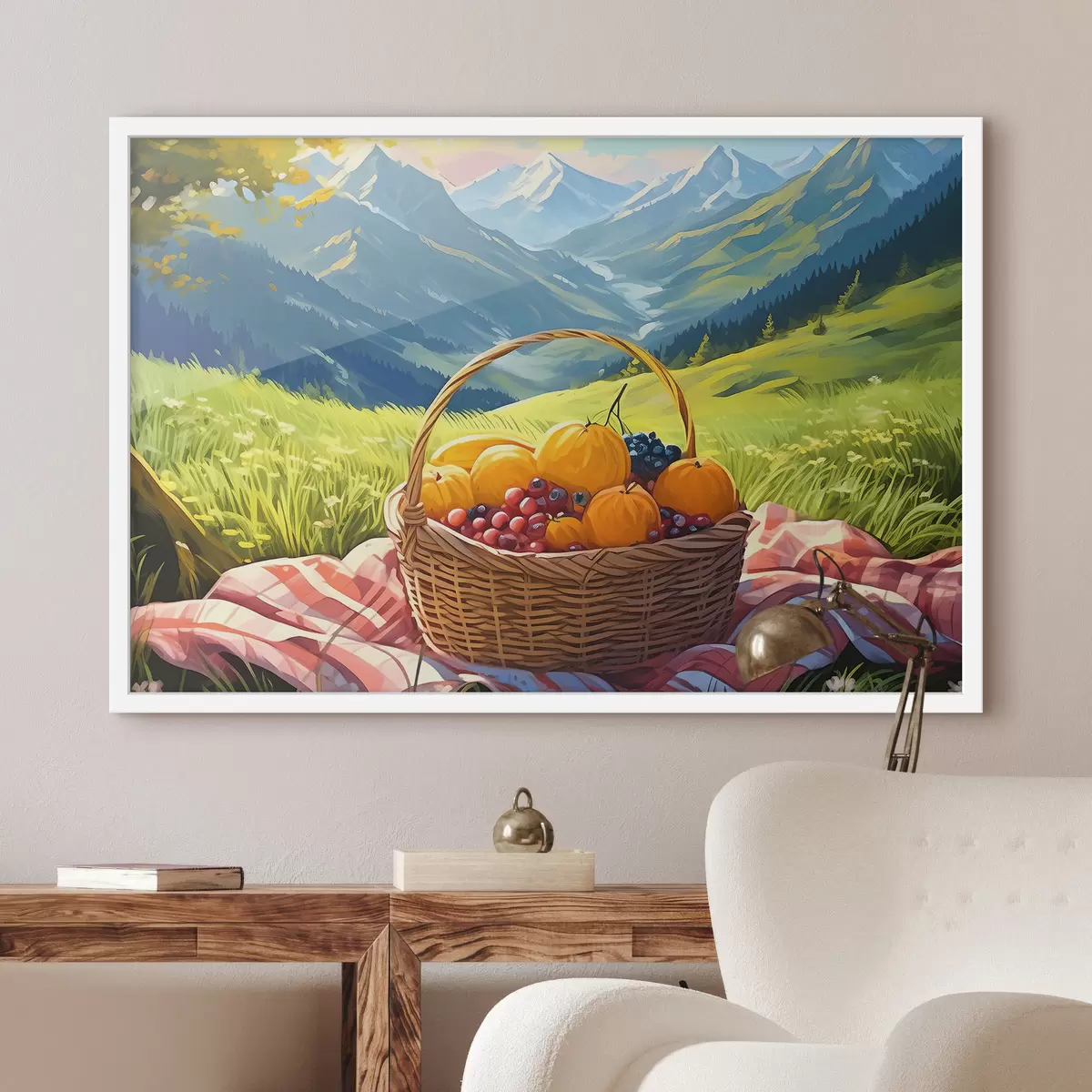 Poster una cesta de frutas en un prado en las montañas Nr f38654