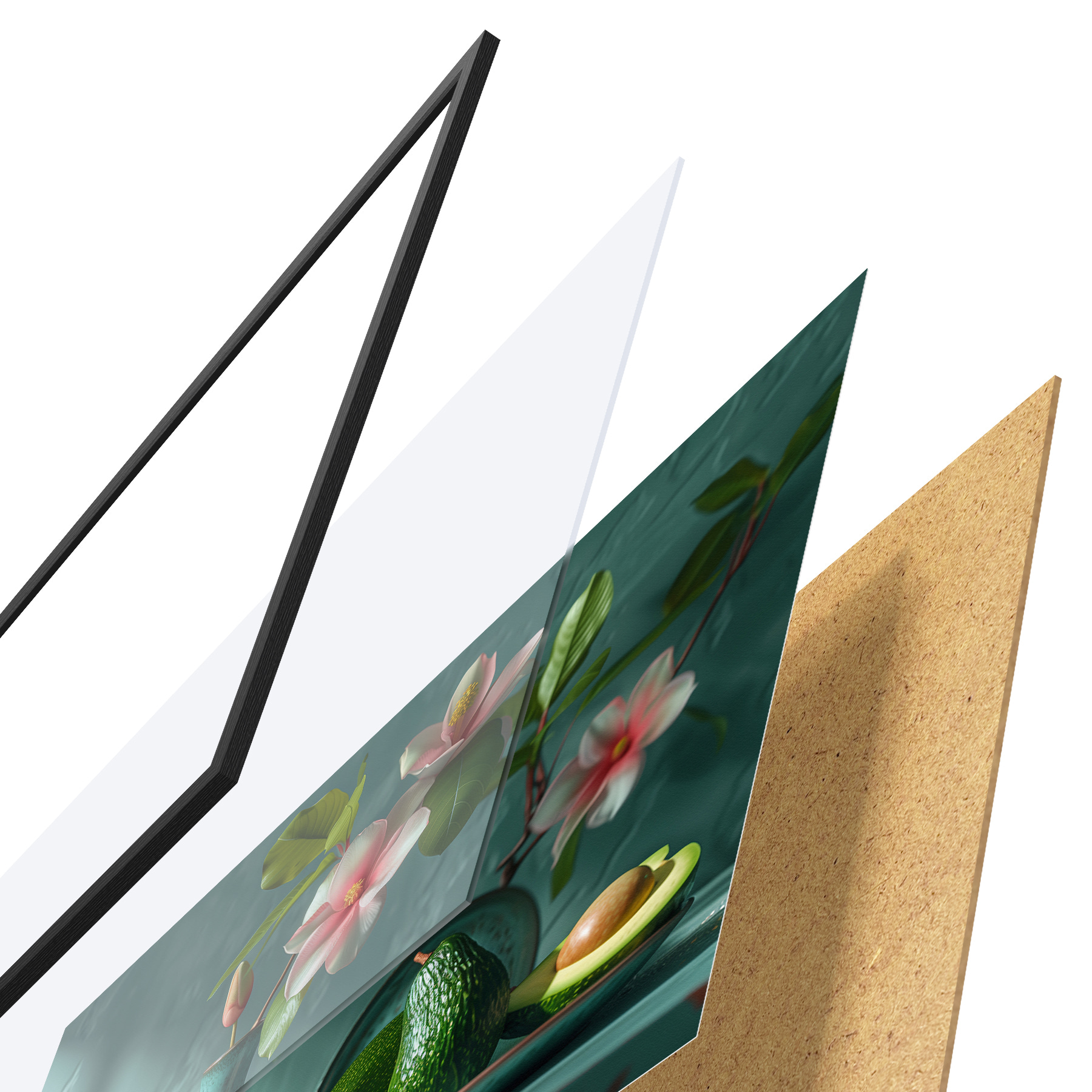 El póster consta de marco, plexiglás, imagen impresa y soporte de aglomerado. El póster puede colgarse inmediatamente en la pared gracias a los soportes de la parte posterior.