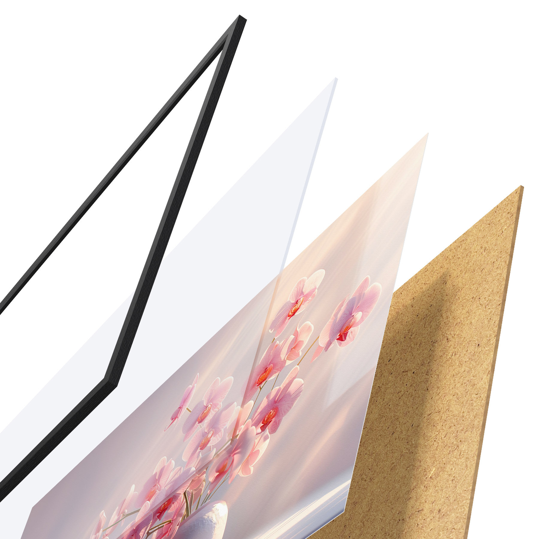 El póster consta de marco, plexiglás, imagen impresa y soporte de aglomerado. El póster puede colgarse inmediatamente en la pared gracias a los soportes de la parte posterior.