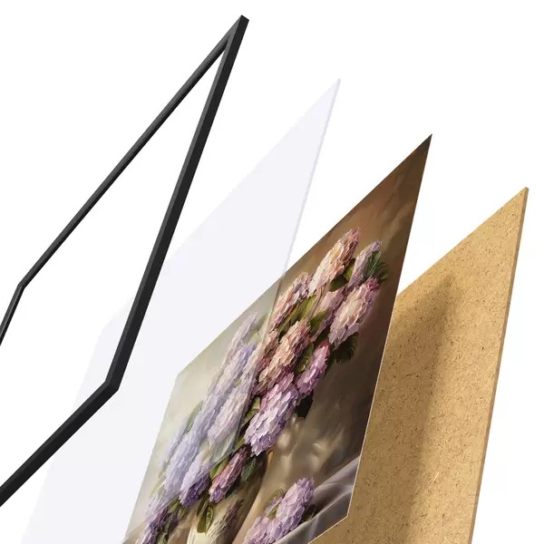 El póster consta de marco, plexiglás, imagen impresa y soporte de aglomerado. El póster puede colgarse inmediatamente en la pared gracias a los soportes de la parte posterior.