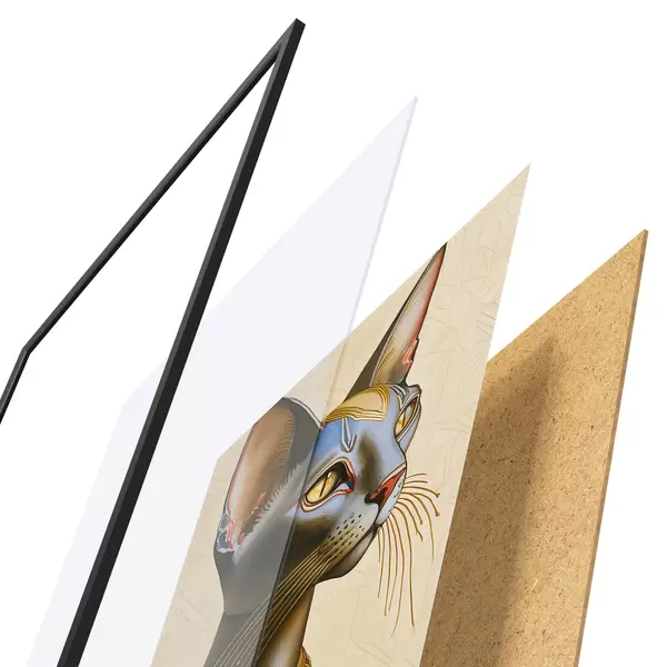 El póster consta de marco, plexiglás, imagen impresa y soporte de aglomerado. El póster puede colgarse inmediatamente en la pared gracias a los soportes de la parte posterior.
