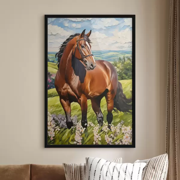 Poster Hermoso caballo en el césped, cielo azul f38727