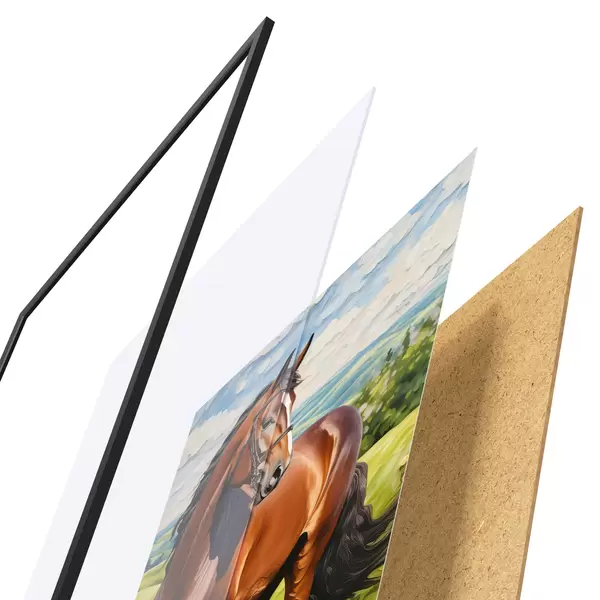 El póster consta de marco, plexiglás, imagen impresa y soporte de aglomerado. El póster puede colgarse inmediatamente en la pared gracias a los soportes de la parte posterior.