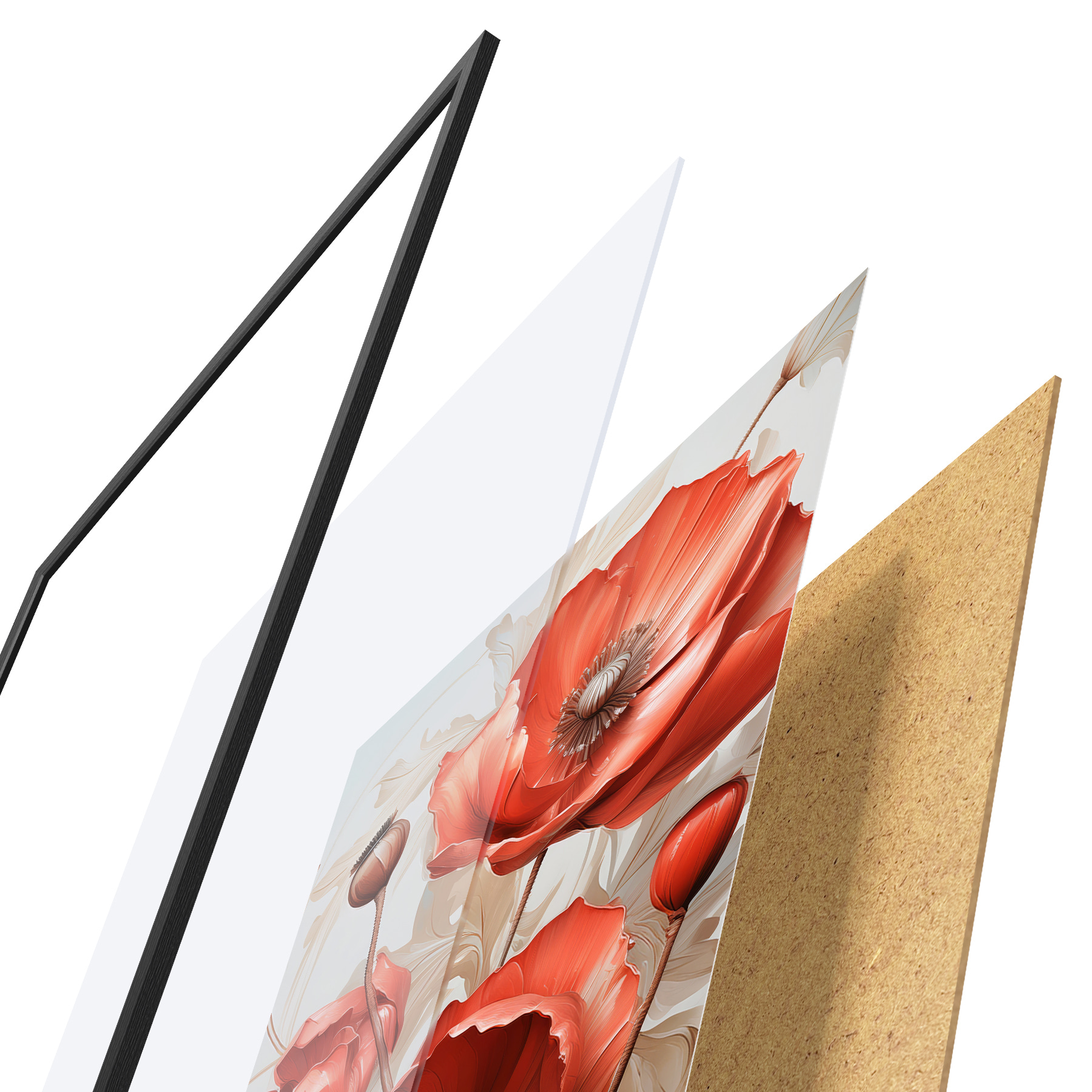 El póster consta de marco, plexiglás, imagen impresa y soporte de aglomerado. El póster puede colgarse inmediatamente en la pared gracias a los soportes de la parte posterior.