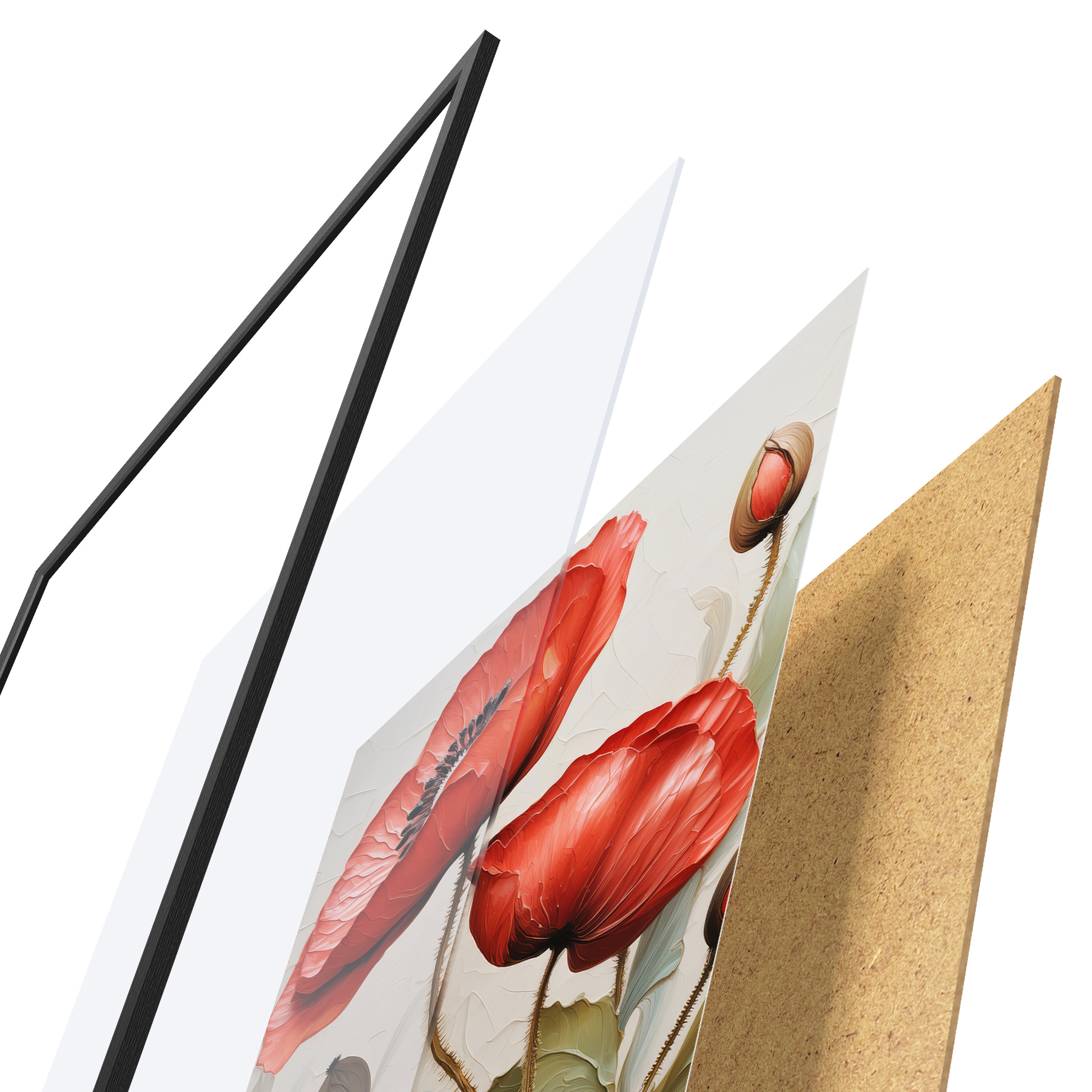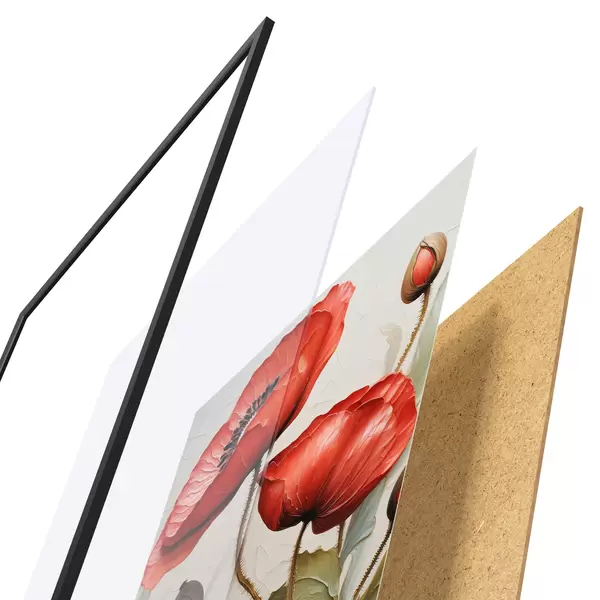 El póster consta de marco, plexiglás, imagen impresa y soporte de aglomerado. El póster puede colgarse inmediatamente en la pared gracias a los soportes de la parte posterior.
