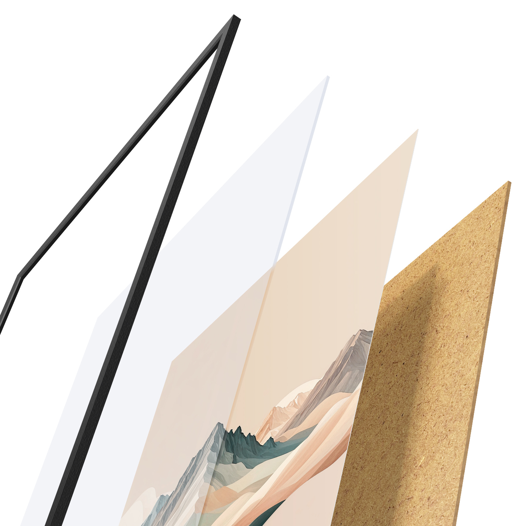 El póster consta de marco, plexiglás, imagen impresa y soporte de aglomerado. El póster puede colgarse inmediatamente en la pared gracias a los soportes de la parte posterior.