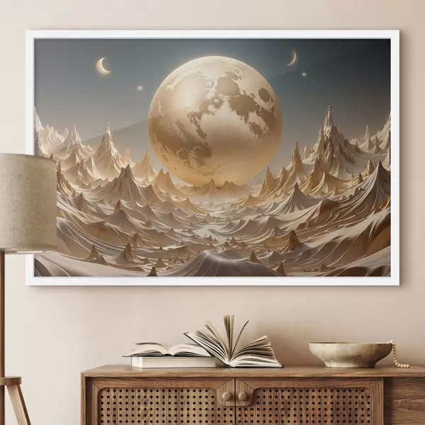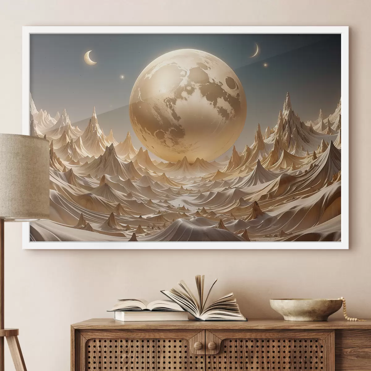 Poster Luna llena resplandeciente sobre un paisaje montañoso surrealista con picos f38775